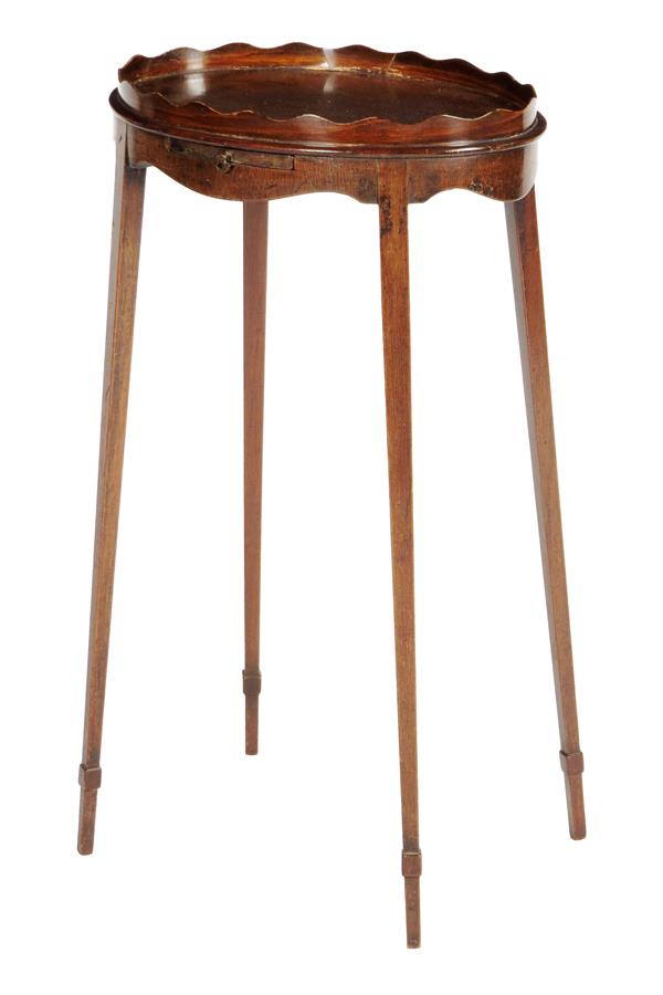 A George III mahogany urn stand, the oval top with a way edge gallery above a pull-out slide, on square tapering legs with applied ankles, 65.3cm high, 37cm wide, 26.2cm deep.