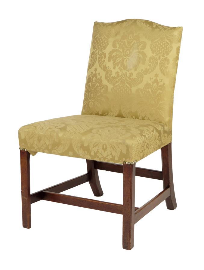 An early George III side chair, the arched padded back and seat upholstered with damask fabric, on moulded and chamfered supports.