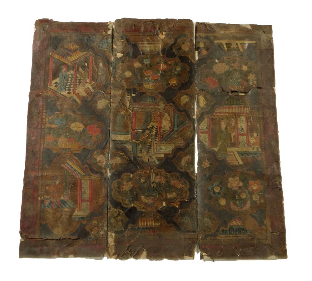Three leather panels, painted with chinoiserie decoration and urns of flowers, 18th century, originally from a screen, 150.5 x 48.5cm.
