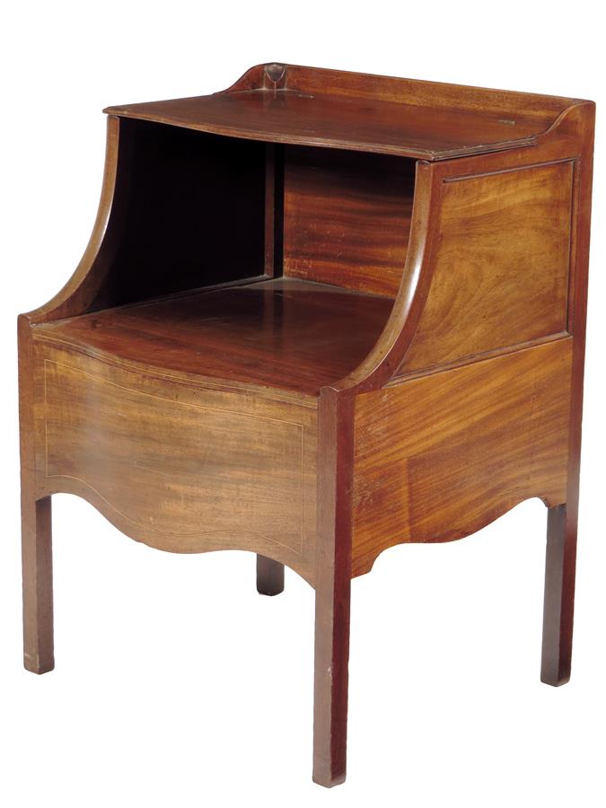A George III mahogany Lancashire commode, inlaid with stringing, the hinged top above a later converted hinged base, with panelled sides and serpentine front, 75.3cm high, 54.3cm wide, 46.5cm deep.