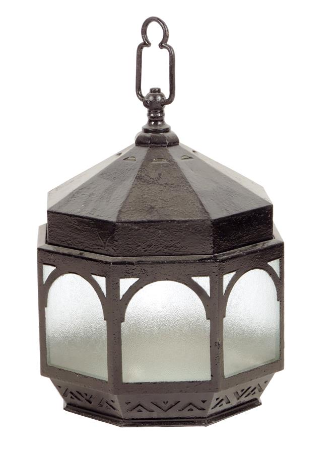 A black painted tole octagonal lantern, with frosted glass panels, 64.5cm high, 41.5cm wide.