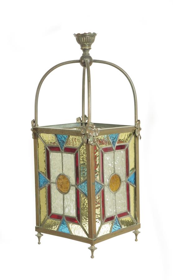 A late Victorian brass and leaded stained glass hall lantern, 52.9cm high, 20cm wide.