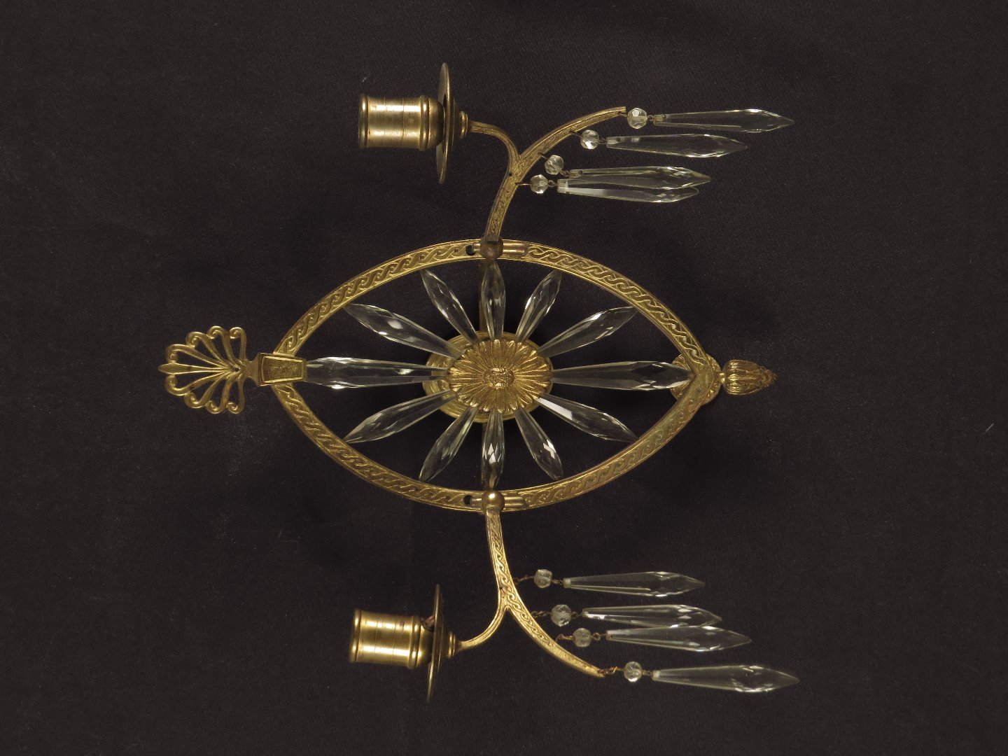 A set of four Edwardian gilt brass wall lights in Adam style, of navette shape decorated with cut glass lustres with an anthemion surmount and a bud pendant, with twin adjustable arms, 33.8cm high, 36cm wide. (4)