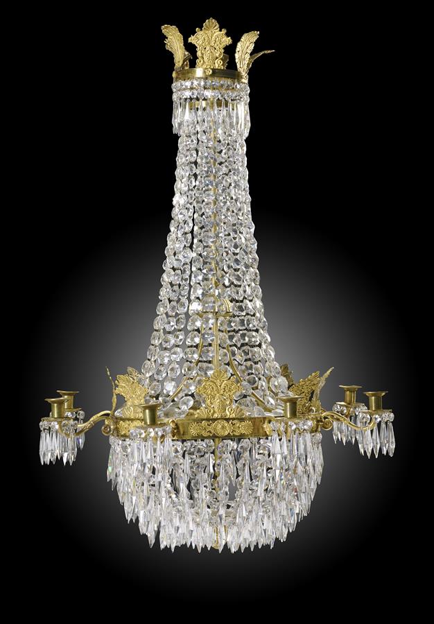 A French Empire ormolu and cut crystal chandelier, the corona with applied palmettes and leaves with chains of drops descending to a conforming circular ring supporting eight scroll arms, the candle sconces hung with drops and lustres, with a bud pendant, later electrified, 121cm high, 79.2cm wide.