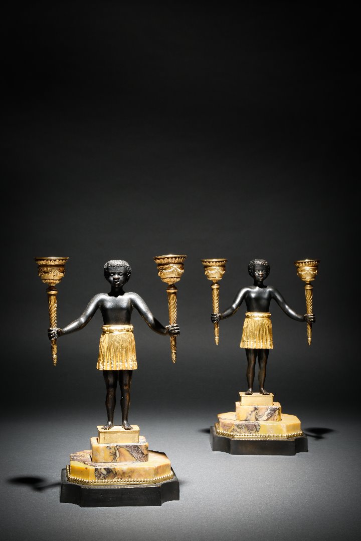 A pair of French gilt and patinated bronze candlesticks, each in the form of a standing Nubian boy holding a pair of torches on a Siena marble stepped plinth base, early 19th century and later, 28.2cm high, 17.5cm wide. (2)
