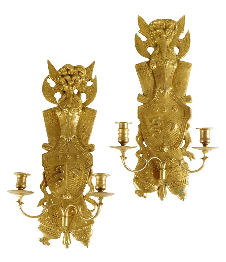 A set of four Restauration ormolu wall lights, each with a backplate decorated with a coat of arms and war trophies, with twin scroll branches and turned nozzles, 53cm high, 28cm wide. (4)