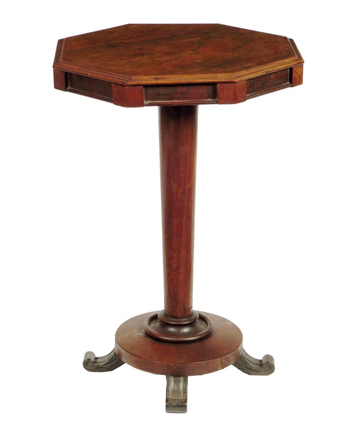 λ A William IV rosewood occasional table, the octagonal top with a moulded edge and with a panelled frieze on a turned tapering stem and scroll feet, 72cm high, 53.2cm wide.