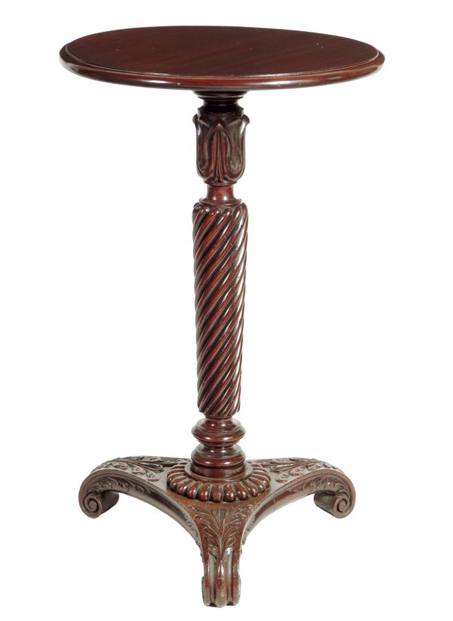 A mahogany occasional table, on a spiral twist reeded stem and a leaf carved triform base, George IV and later adapted from a pole firescreen, 66.5cm high, 40.6cm diameter.
