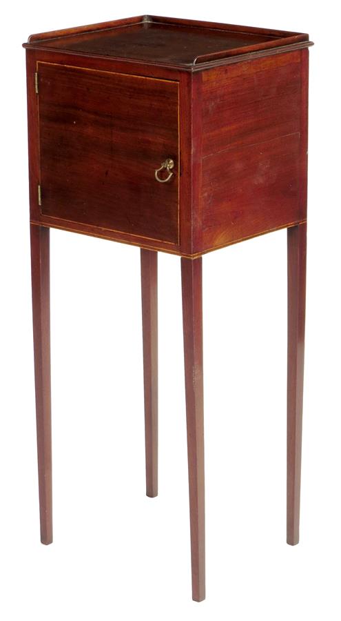 A George III mahogany bedside cupboard, inlaid with stringing and with a three quarter gallery, 83cm high, 33.8cm wide, 28.8cm deep.
