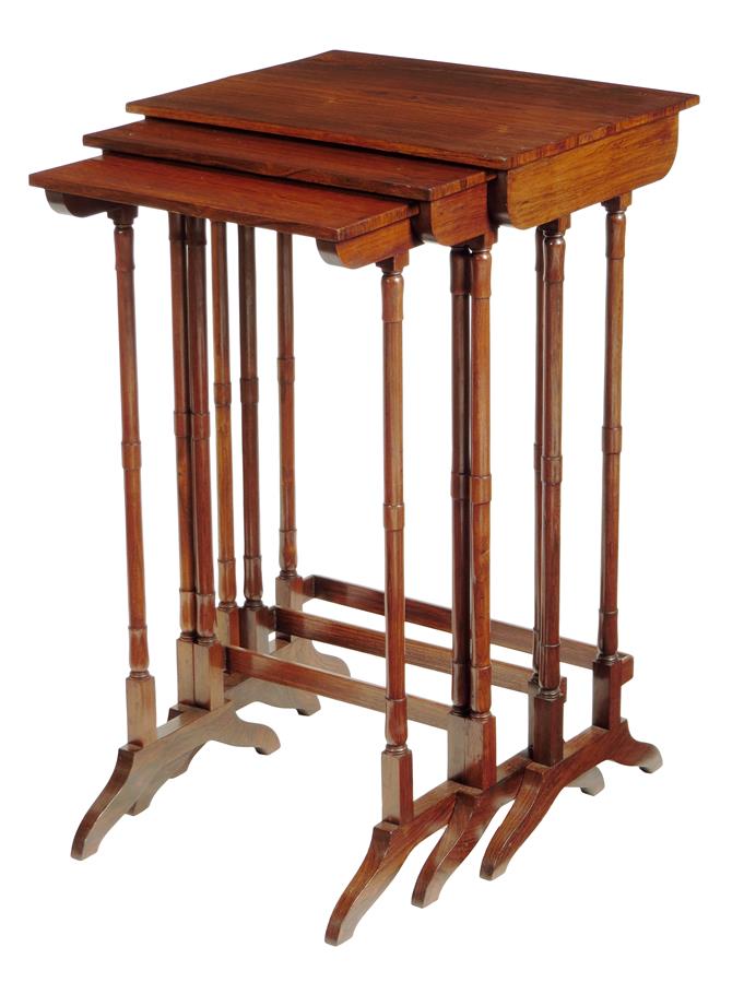 λ A nest of three George IV rosewood occasional tables, each with turned supports, 71.3cm high, 44cm wide, 33cm deep. (3)