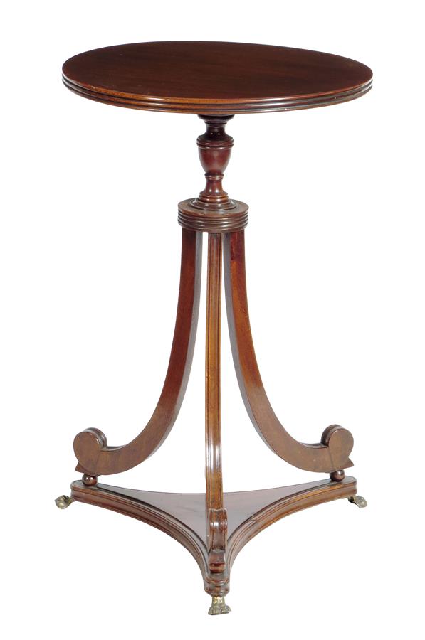 A mahogany occasional table, on scroll supports and brass paw feet, George III and later adapted from a pole firescreen, 65cm high, 39cm diameter.