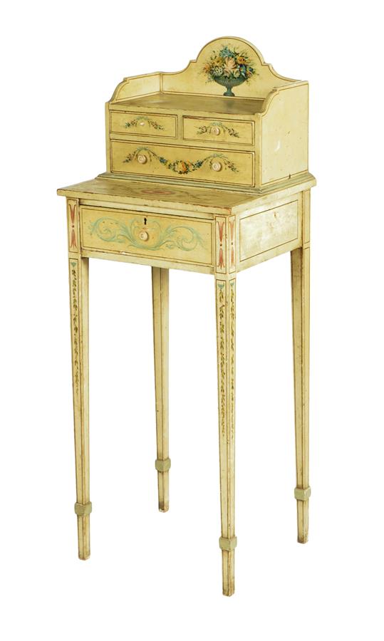 λ A late George III painted pine cheveret, decorated with an urn of flowers, swags of flowers and scrolling leaves, the galleried top above three drawers with ivory handles, with square tapering legs and applied ankles, 100.8cm high, 38cm wide, 32cm deep.