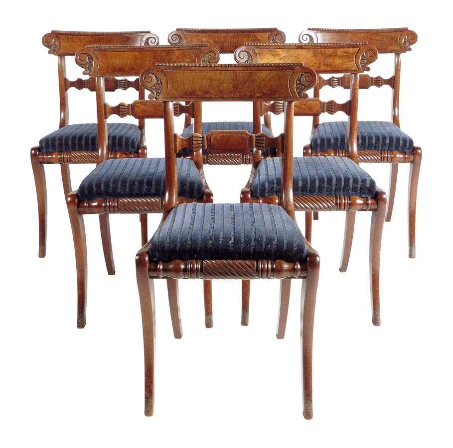 A set of six George IV mahogany dining chairs, each with a panelled top rail with a nulled moulding, above a bar back and a drop-in seat with a turned spiral twist moulding to the front seat and on sabre legs. (6)