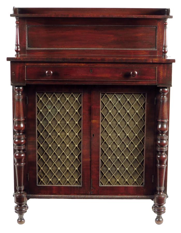 A William IV mahogany side cabinet, with nulled mouldings, the raised top above a frieze drawer and a pair of gilt brass trellis doors enclosing a shelf and flanked by a pair of turned columns, 121.8cm high, 89.8cm wide, 31cm deep.