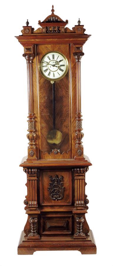 A German walnut longcase clock, the two-piece cream enamel dial with the trademark for Gustav Becker, subsidiary seconds, the two-train movement with pendulum supported from the backboard, in a quarter veneered walnut case flanked by carved and fluted pilasters, the base with various panels and appliques, 218cm high.