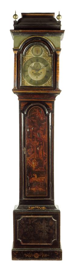 A japanned longcase clock, the eight day movement striking on a bell, with an arched brass dial with strike silent and foliate spandrels, the chapter ring with Roman and Arabic numerals with subsidiary second dial and date aperture 'James Smith London', the brass mounted hood with turned finials the case decorated with chinoiserie figures, the base with outline mouldings, 243.3cm high, 53.4cm wide.