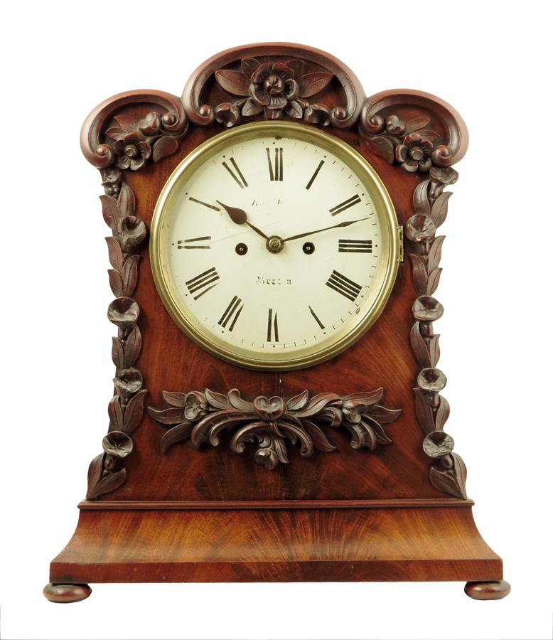 A Victorian mahogany mantel clock, the white painted dial with faded signature, the two-train fusee movement in a case with triple scrolled top, the front applied with carved floral swags, 19in (49cm) high.