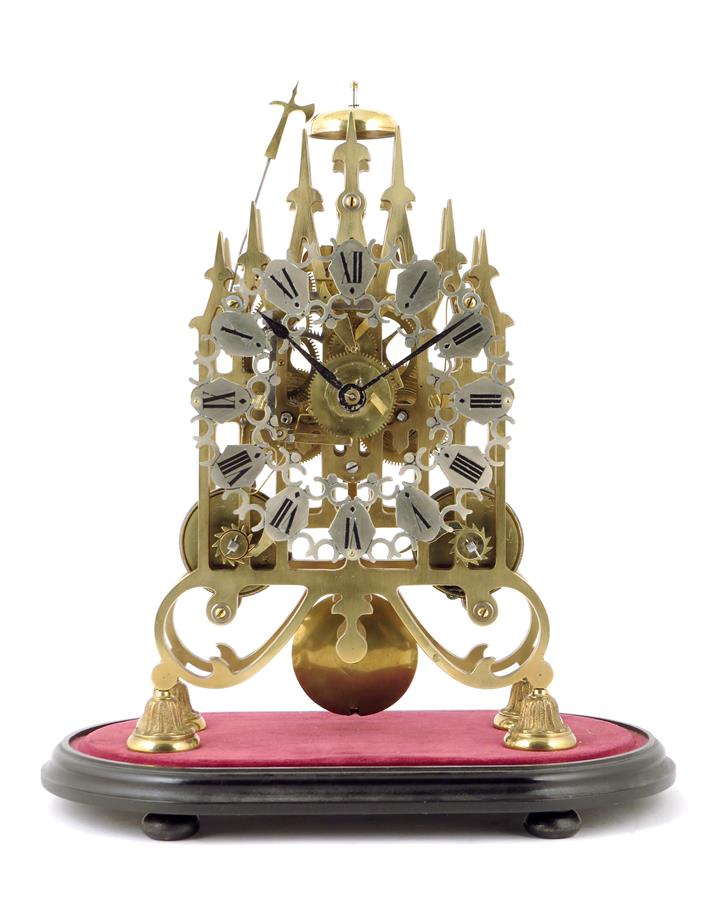 A striking skeleton clock, the two-train fusee movement with anchor escapement and striking on a bell above, in architectural plates with scrolled bases, with a pierced silvered chapter ring, on ebonized stand, 16in (41cm) high with glazed dome.
