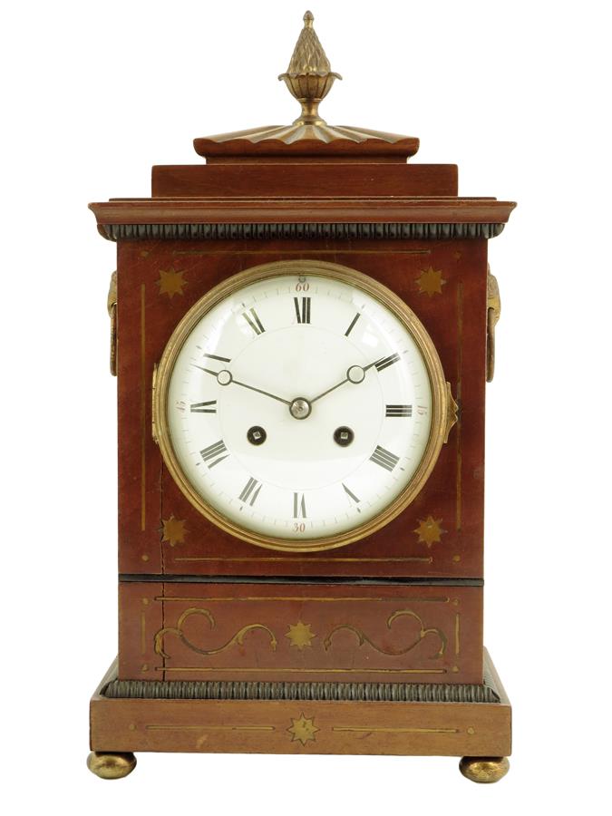 A French mahogany mantel clock, the striking movement stamped 'F. Martin, no. 316', numbered pendulum, in a Regency style brass inlaid case with gadrooned top and pineapple finial, drop handles and brass bun feet, 15in (38cm) high (including finial).