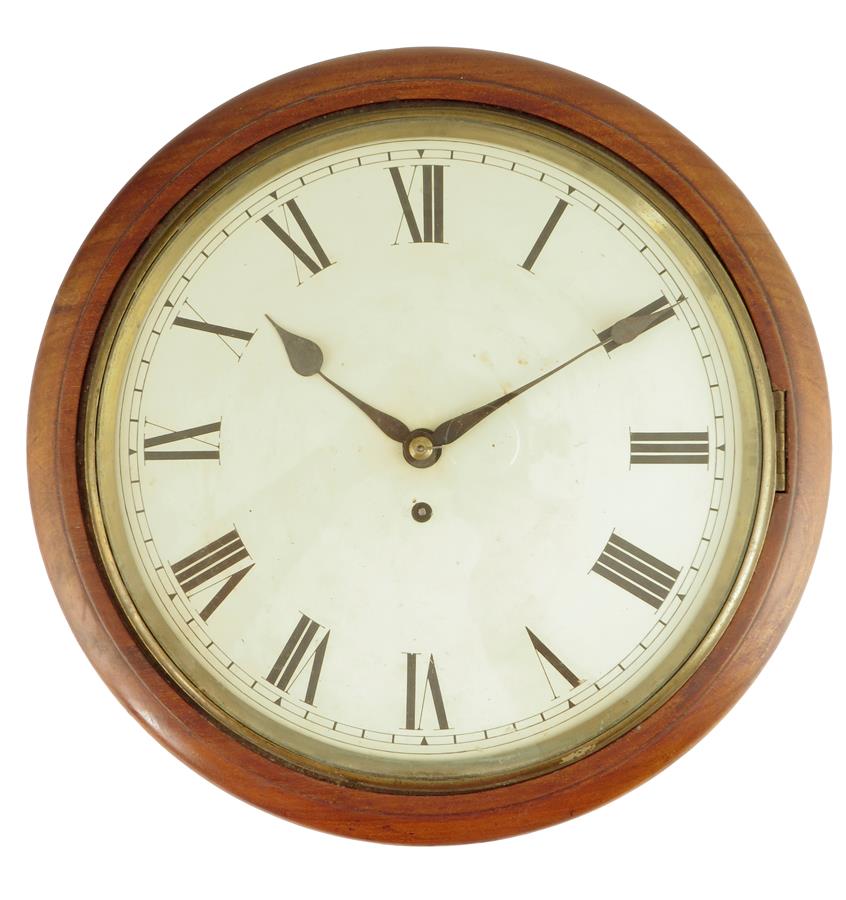 A mahogany dial wall clock, the single fusee movement within a moulded case and a brass bezel, the painted dial with Roman numerals, 38cm diameter.