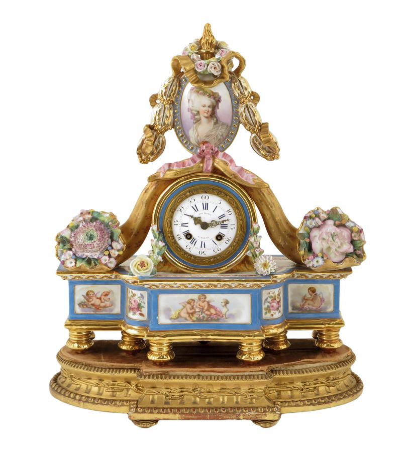 A French porcelain mantel clock, the white enamel dial signed 'Hry Marc a Paris', the drum striking movement stamped 'Hy. Marc, Paris, 20697', numbered pendulum, in a drum case flanked by floral cornucopia, the shaped base decorated with putti and flowers against a blue ground, the back similarly decorated, surmounted by a portrait miniature of a lady beneath flowers and ribbons, 40cm high, on a giltwood stand.