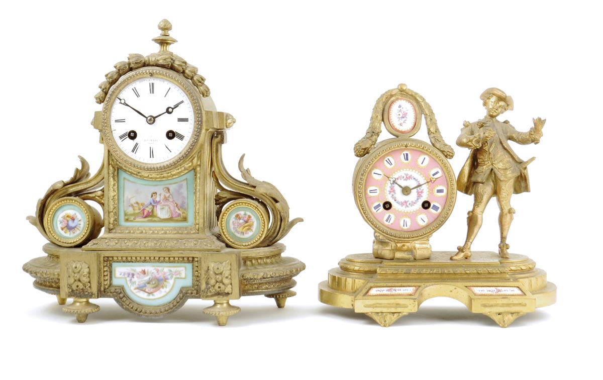 A French gilt spelter mantel clock, the movement and dial signed 'Hry. Marc, Paris', the case with porcelain plaques decorated with figures and birds against a green ground, 29cm high and another spelter and porcelain clock by Japy Freres, in a drum case flanked by a courtly figure, floral plaques against a pink ground, 23cm high. (2)