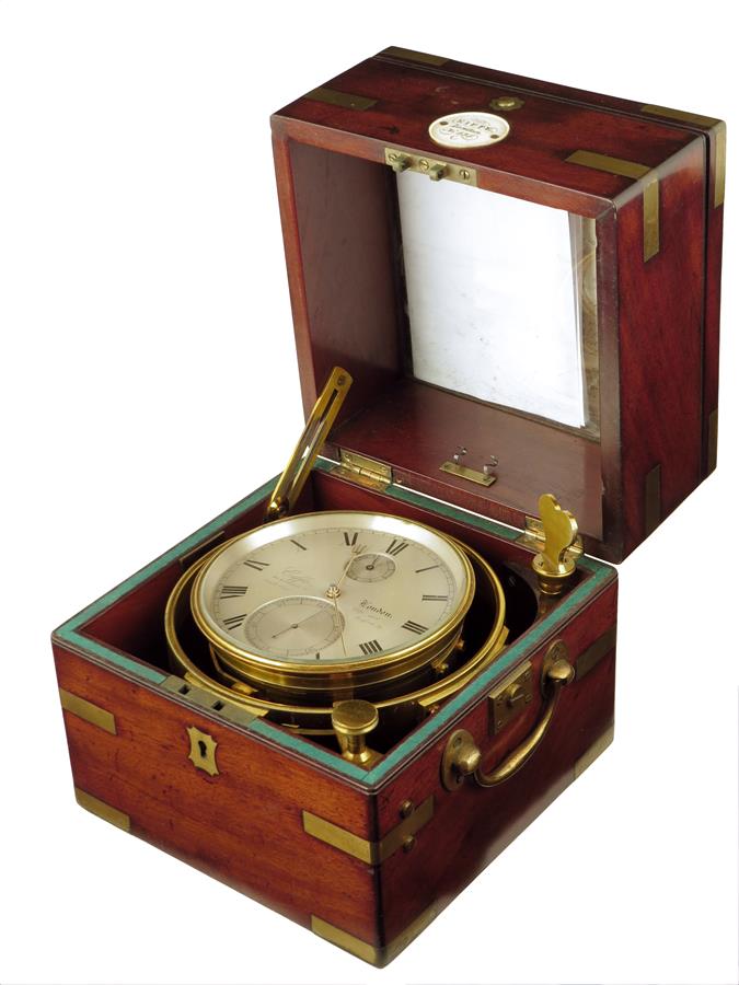 John Sweetman Eiffe. An eight day marine chronometer, the fusee movement with a spring detent escapement, the silvered dial with Roman numerals, with subsidiary dials for seconds and wind up/down, inscribed 'Eiffe London 48 Lombard St. City and South Cresct Bedford Sq', numbered 535, with gilt trident and poker hands, in a brass gimbal and a three tier mahogany and brass mounted case, the lid with a brass plaque inscribed 'C. F. VENN 1903' and with an ivory rondel inscribed 'EIFFE London No. 535', with side carrying handles, the inside of the lid with a printed trade label for 'E. DENT & Co. LTD.' and with typed labels from His Majesty's Service stating that the chronometer is the property of Rev. R. T. Venn and is on loan to the Admiralty, '16th Sep 1941' with a facsimile copy of the Royal Observatory Abstract of Rates, second quarter 19th century, 20.2cm high, 20.7cm wide, 19cm deep.
