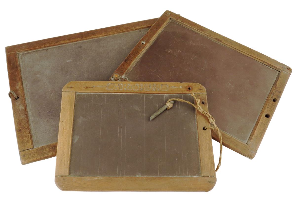Three late 19th century Folk art school blackboards, each with a wooden frame, one carved with the name 'ARTHUR', 33 x 22.5cm. (3)