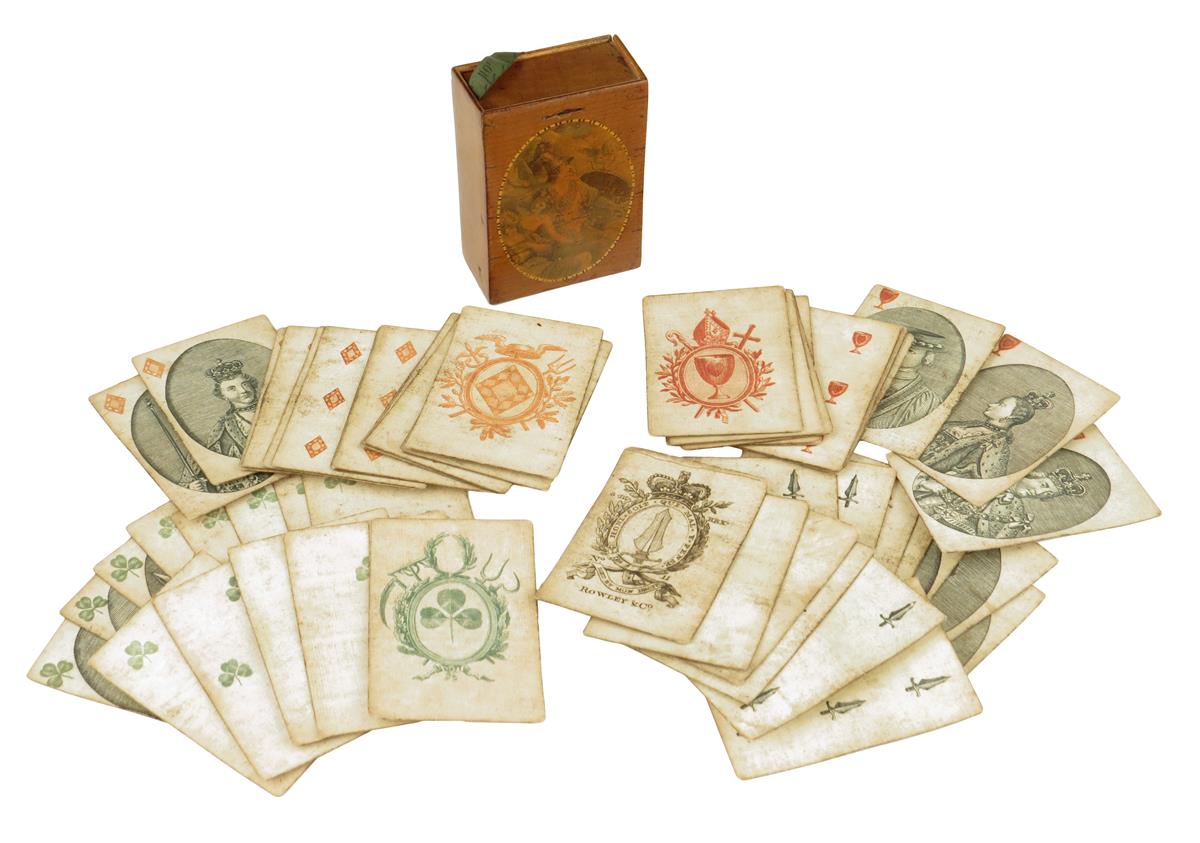 A rare pack of George III 'Monarchs of Europe' playing cards by Rowley & Co., steel engraved on card, the suits as portraits of the kings and queens of England, France, Spain and Russia, with their attendants as knaves, with plain backs, c.1775, together with a harewood card box with a sliding cover and oval stipple engraved prints, 10.2cm high, 7.4cm wide. (53)