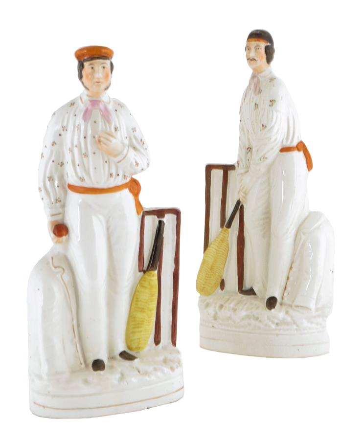 Cricketing interest. A matched pair of Victorian Staffordshire pottery figures of cricketers