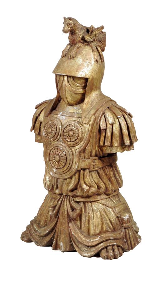 A carved giltwood figurehead, 'Triumph', in the form of a suit of armour, 96.5cm high, 52cm wide.