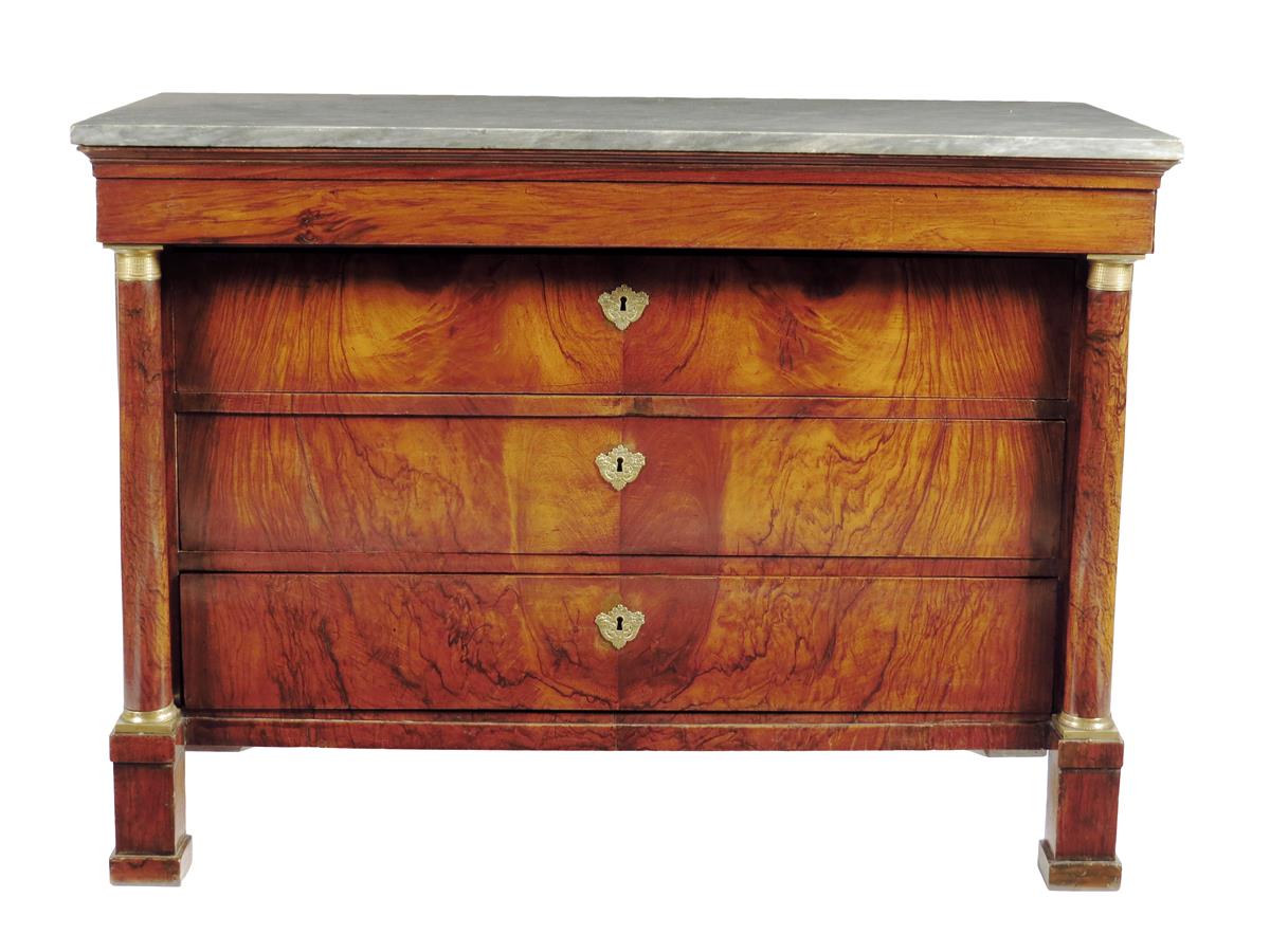 A pair of early 19th century Italian walnut commodes, each with a grey marble top, above a branded mark 'Crown, I.G.P.', above a frieze drawer and three long drawers flanked by a pair of columns with gilt brass mounts with engine turned decoration, on block feet, 92.2cm high, 127cm wide, 61.6cm deep. (2)