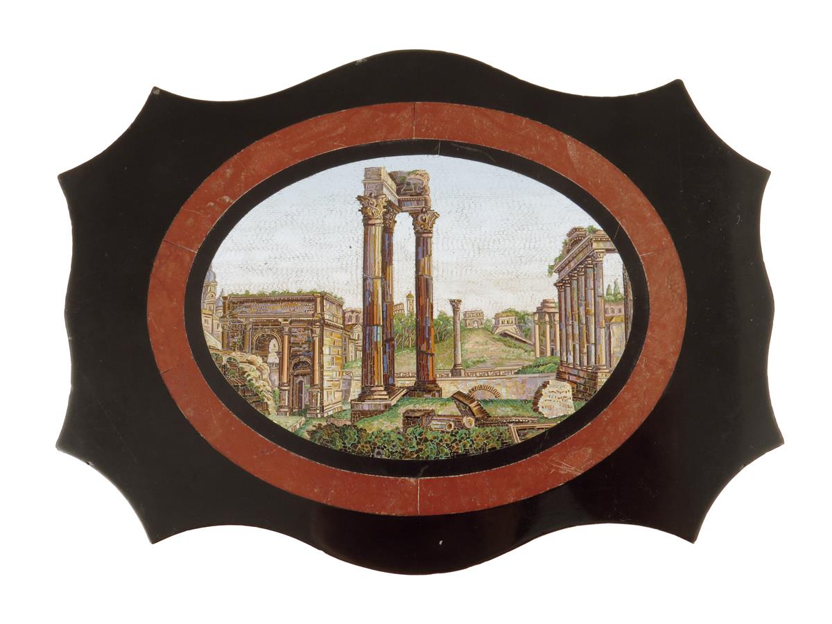 A late 19th century Italian micromosaic paperweight, of serpentine outline with a band of red marble and inlaid with an oval panel depicting the Roman Forum with The Temple of Vespasian and Titus in the foreground, 13.4 x 18.5cm.