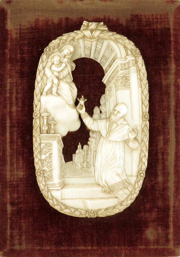 λ A 19th century French Dieppe relief carved ivory plaque, depicting St. Augustine in a classical landscape offering his symbol, the sacred heart of fire to the Madonna and child, 15 x 8.3cm, mounted on a velvet covered panel.