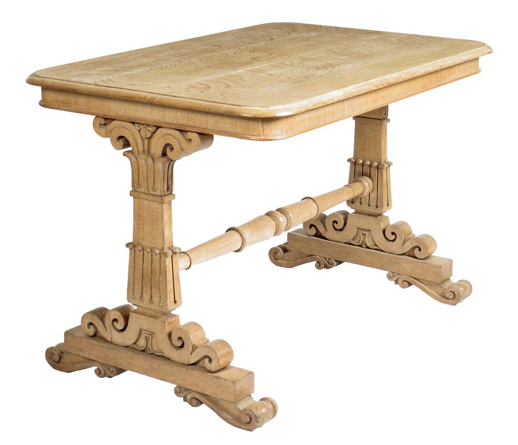 A William IV bleached oak library table, on scroll carved trestle ends and feet united by a turned stretcher, with an ivorine label inscribed 'JAMES PHILLIPS & SONS, UNION STREET, BRISTOL', 74.9cm high, 114.1cm wide, 75.2m deep.