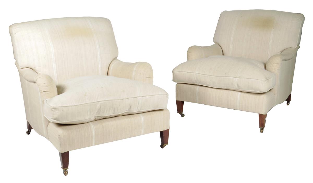 A pair of Howard style easy armchairs by Stephen Perkins, each on beechwood supports, the back leg stamped 'By Stephen Perkins CIRENCESTER ENGLAND STEPHEN PERKINS', on brass castors, modern. (2)