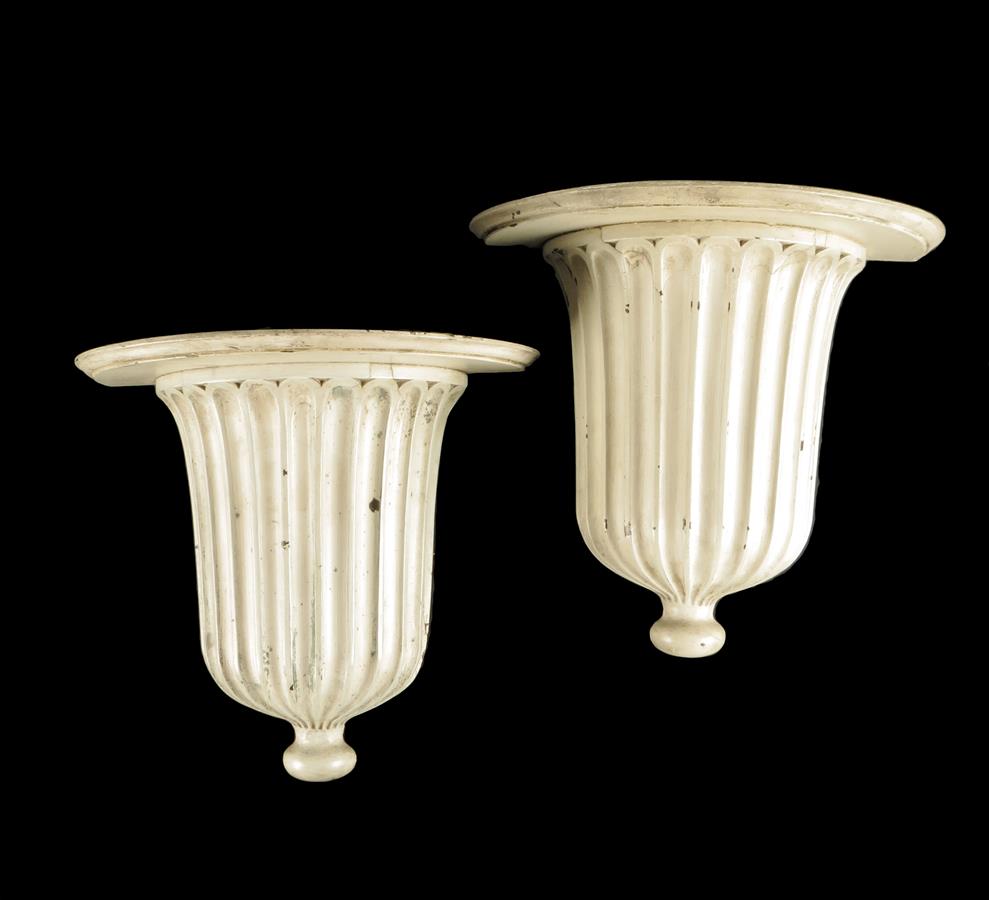 A pair of carved wood and painted wall brackets, each in the form of a fluted urn, 31.5cm high, 35.3cm wide. (2)