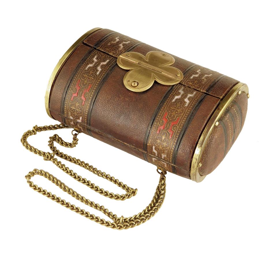 A Victorian brown leather and gilt brass mounted bag etui, the interior with a pair of scissors, a thimble, a needle, a pin cushion and a stiletto, with chain handles, 12.8cm wide.