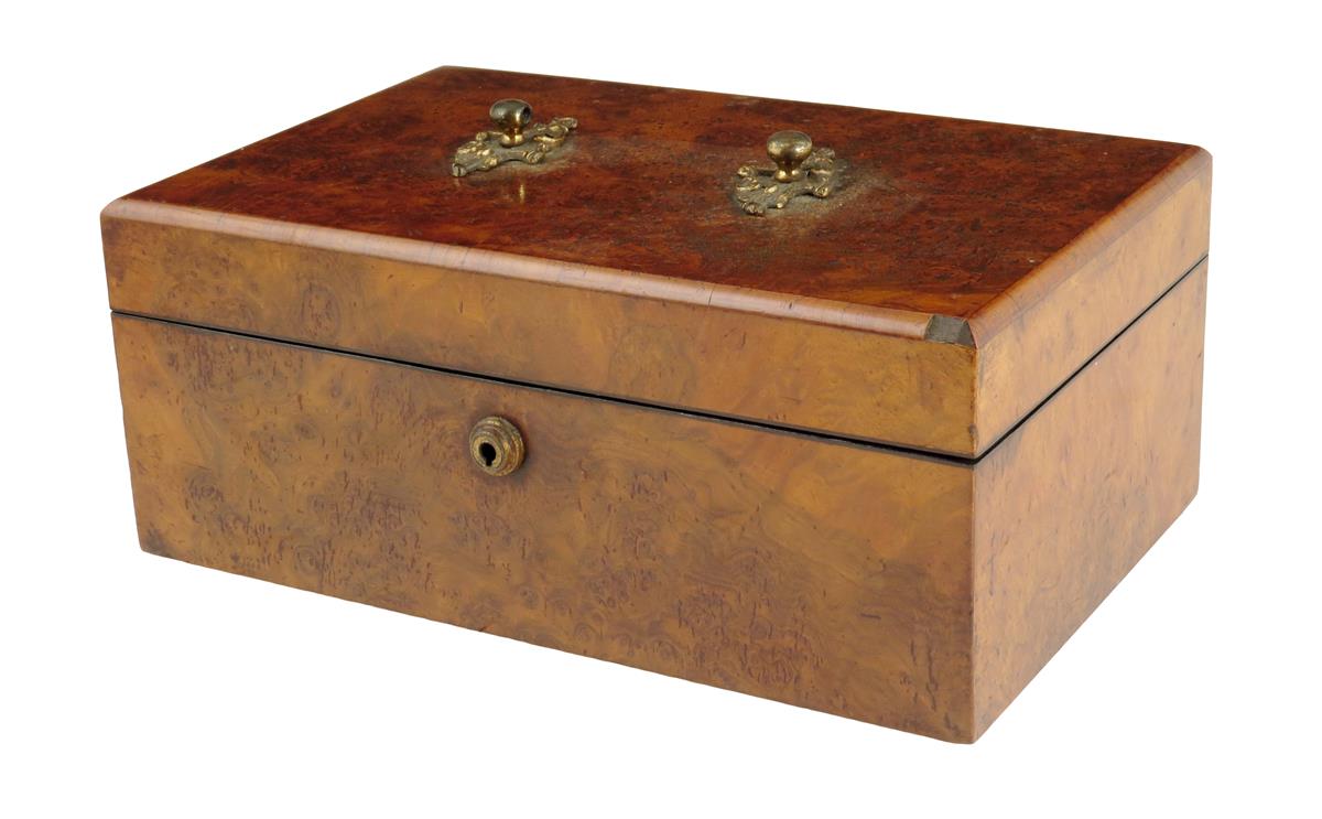 An early 19th century burr walnut tea chest, the interior with a lift-out tray with three hinged compartments, each with a turned bone handle, 12.6cm high, 28.1cm wide.