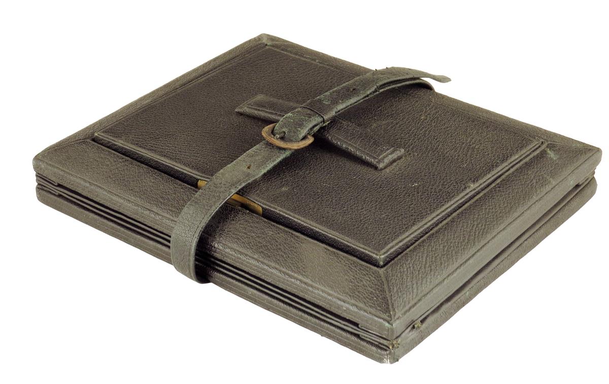 A Victorian black leather document case by Parkins & Gotto, the hinged lid with a stationery pouch and an expanding concertina compartment with a gilt crown and garter stamp inscribed '24 & 25 OXFORD ST. LONDON MANUFACTURED BY PARKINS & GOTTO', with a brass Bramah lock, 23 x 28.3cm.