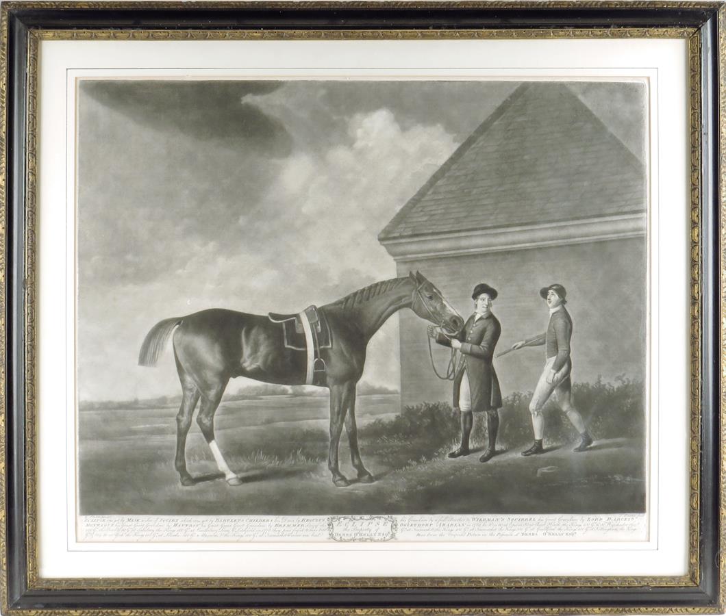 After George Stubbs (1724-1806). 'ECLIPSE the Property of DENES O'KELLY ESQR', a mezzotint by Thomas Burke, 46 x 56.5cm in a glazed, gilt and ebonized carved Hogarth type frame, the verso with a Parker Gallery Label.