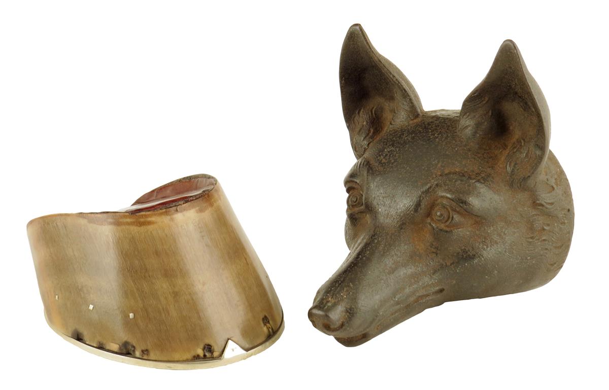 A Victorian cast iron doorstop in the form of a fox head, 16.3cm high, together with a silver plated mounted hoof paperweight by Peter Spicer & Sons, Leamington. (2)