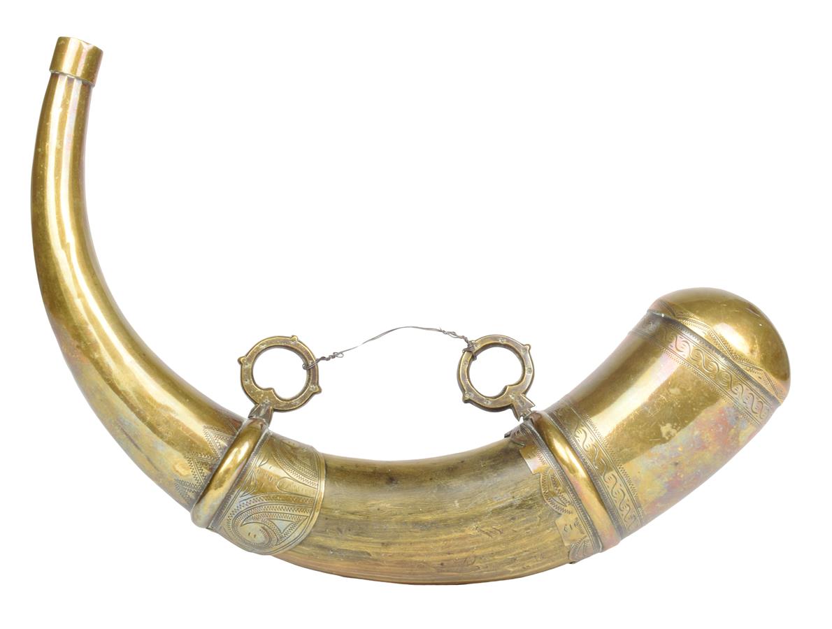 A Moroccan cow horn and brass powder horn