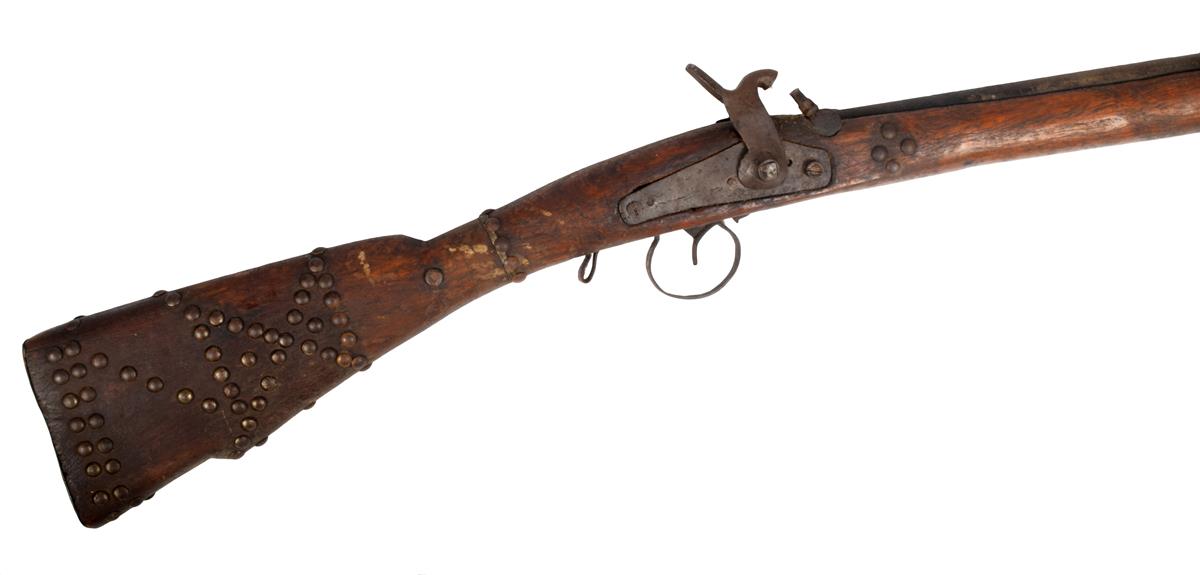 An African percussion rifle, with a 70cm long barrel marked LT2768, with a native wood full stock with applied stud decoration, with ram-rod, 115cm long.