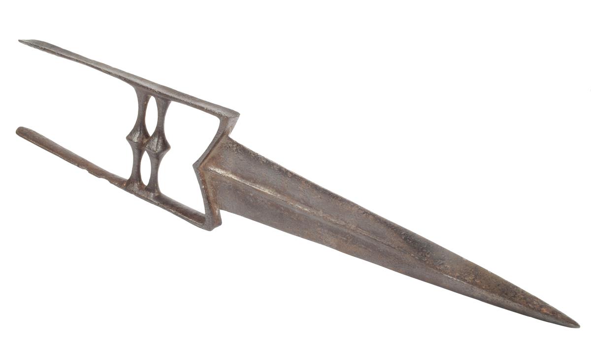 An Indian steel katar, the blade with a medial ridge and swollen tip and with open grip, 43cm long.