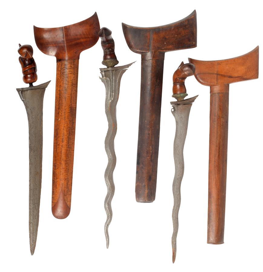 Three Malayan kris; one with a straight edge blade and with a wood hilt carved a stylized Garuda bird, in a hardwood sheath, 50cm long, the other two with wavy blades, carved wood stylized Garuda bird hilts and hardwood sheaths, 47cm and 48.5cm long. (6)