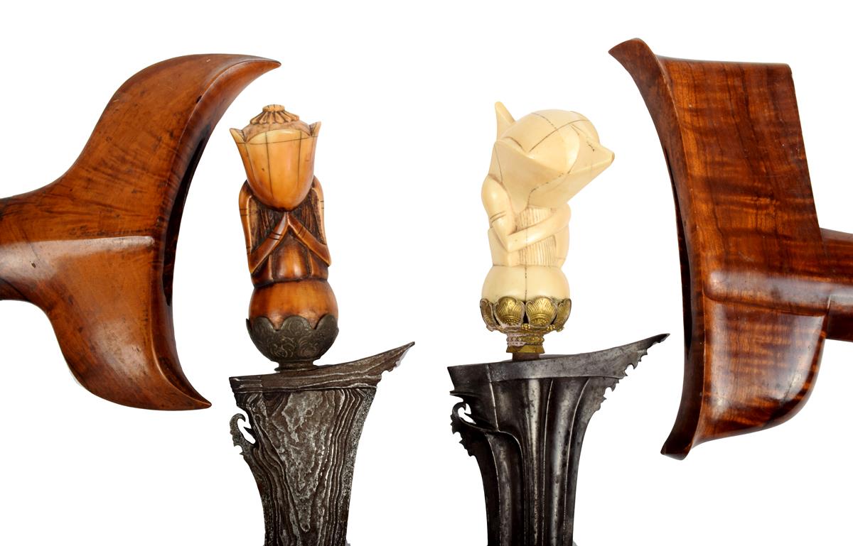 λ ‡ A Malayan kris, with a 35cm long fullered steel straight edge blade, a gilt metal petal ferulle and a marine ivory hilt carved as a stylized Garuda bird, in a hardwood and marine ivory sheath, 46cm long and a Malayan kris, with a wavy blade and an ivory hilt carved a stylized figural torso, in a hardwood sheath, 45cm long. (4)