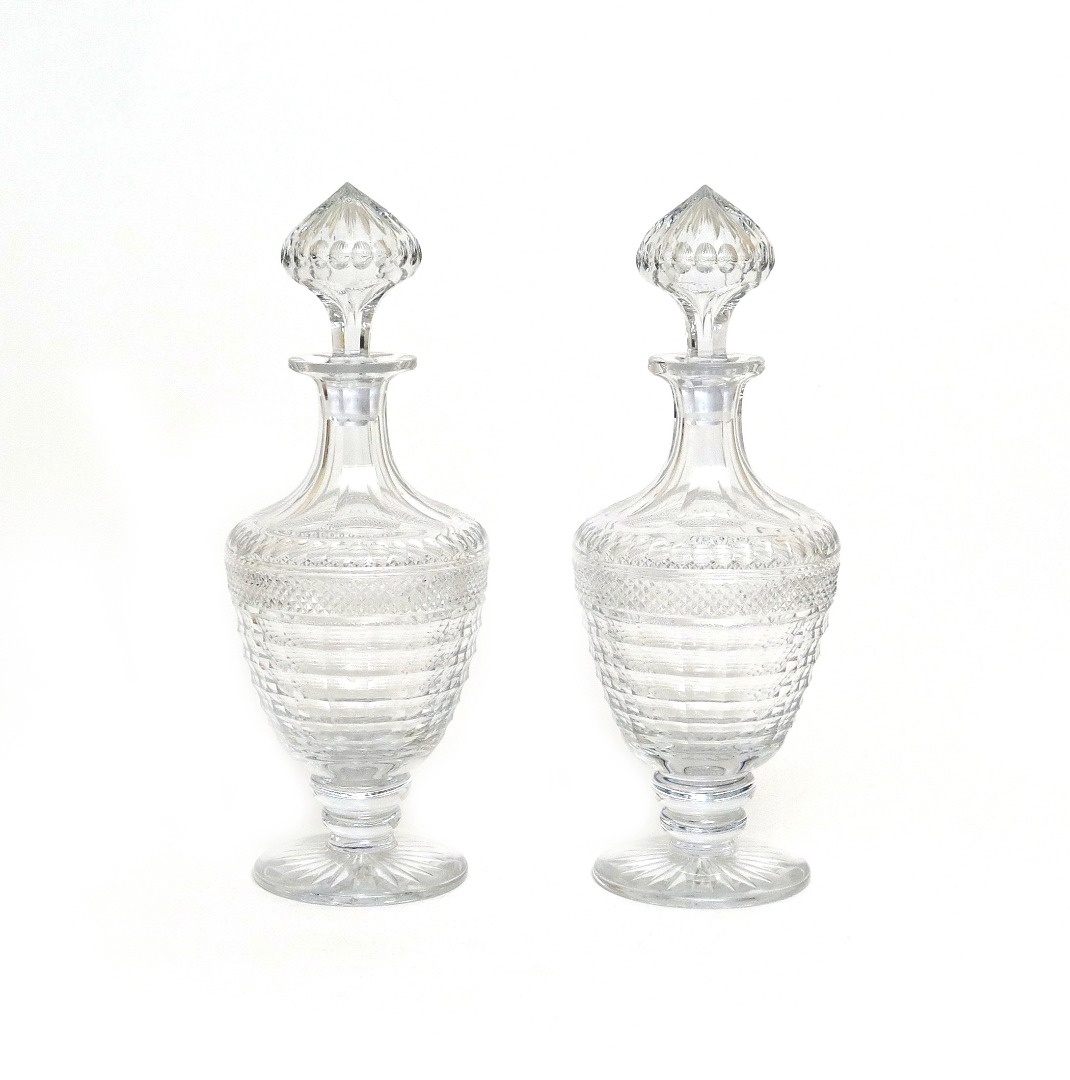 A good pair of cut glass decanters and stoppers 19th century, the sides stepped and faceted, rising to a hobnail cut band, the shoulders with a band of polished ovals, 33cm. (4)