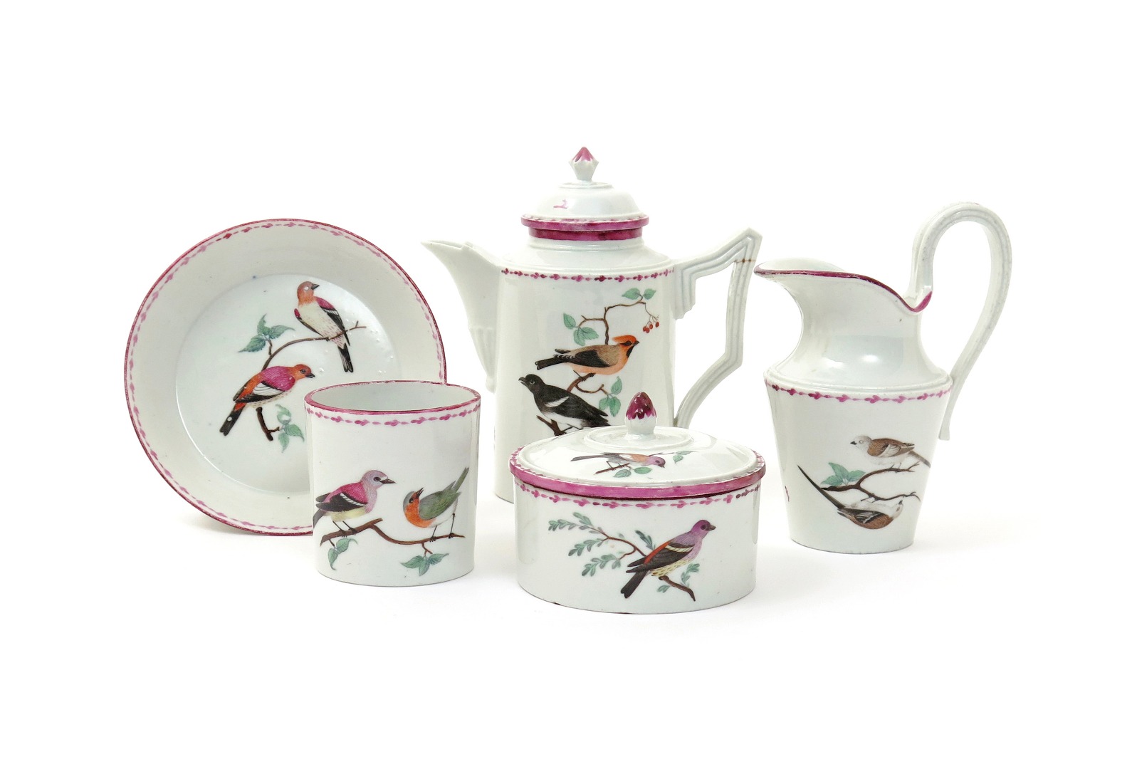 A German porcelain part coffee service late 18th/early 19th century, painted with birds perched in branches, with puce husk borders. Comprising: a small coffee pot and cover, a milk jug, a sugar box and cover, a coffee can and a saucer. (7)