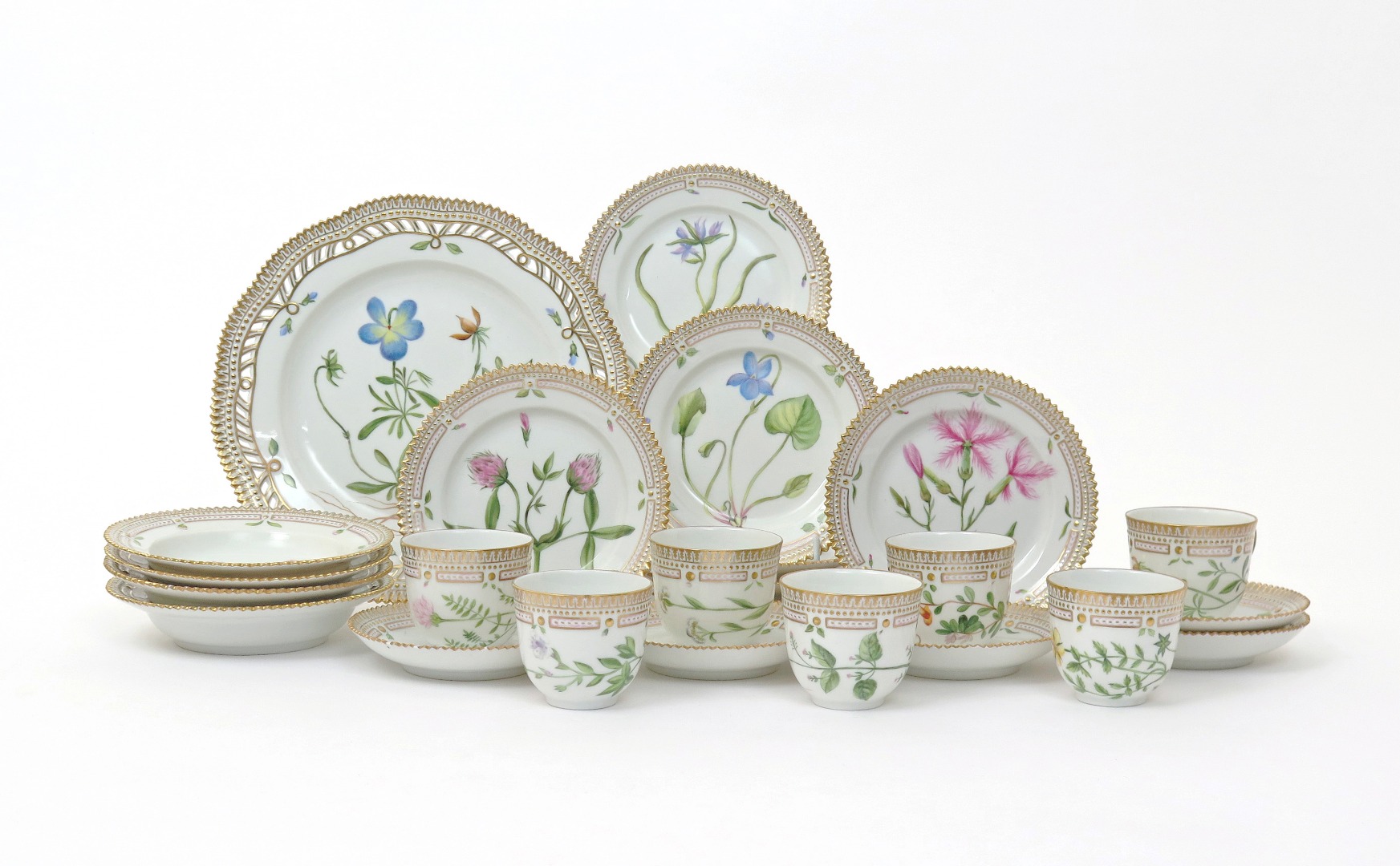 A Royal Copenhagen Flora Danica part service 20th century, painted with floral specimens, titled to the reverse, within moulded gilded rims, the plants including Amerorchis rotunifolia, Fedia Olitoria, Scilla verna Huds. and Trifolium alpestre Mull. Comprising: a plate, seven small plates, four small bowls, seven cups and five saucers. (24)